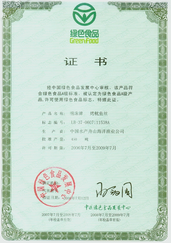 上一篇 | 綠色產(chǎn)品證書(shū)-烤魷魚(yú)須(足)