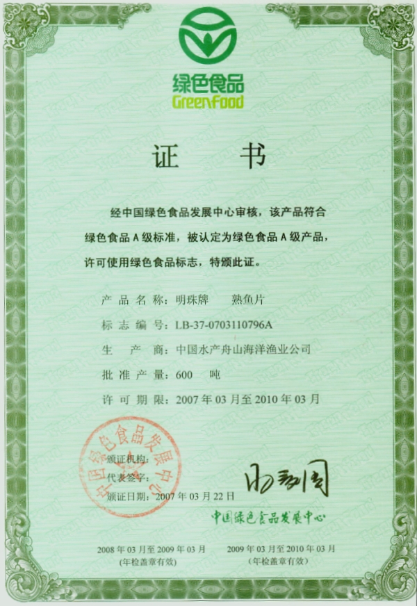 綠色產(chǎn)品證書-熟魚片